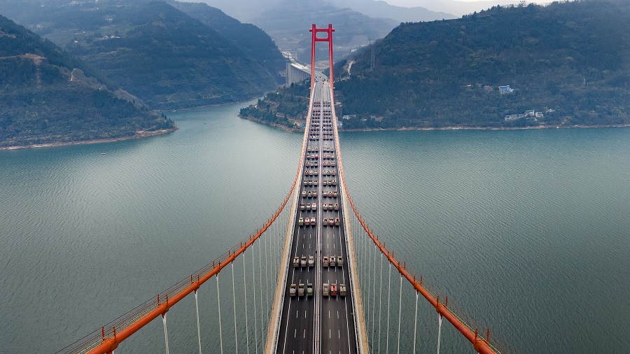 據悉,復興長江大橋是江龍高速最大的控制性工程,也是長江上游主徑跨度最大的懸索橋,其設計長度為左幅1543米、右幅1503米,橋面寬度41.1米,設雙向六車道+應急車道+人行道。江龍高速建成通車后,將大幅縮短云陽城區與龍缸等核心景區的距離,車程將由原來的2小時縮短至約40分鐘,同時,該線路有效串聯紅池壩等沿線旅游資源,將惠及渝東北中部區域約200萬群眾的出行,對完善區域路網、促進交旅融合,推動沿線鄉鎮鄉村振興具有重要意義。